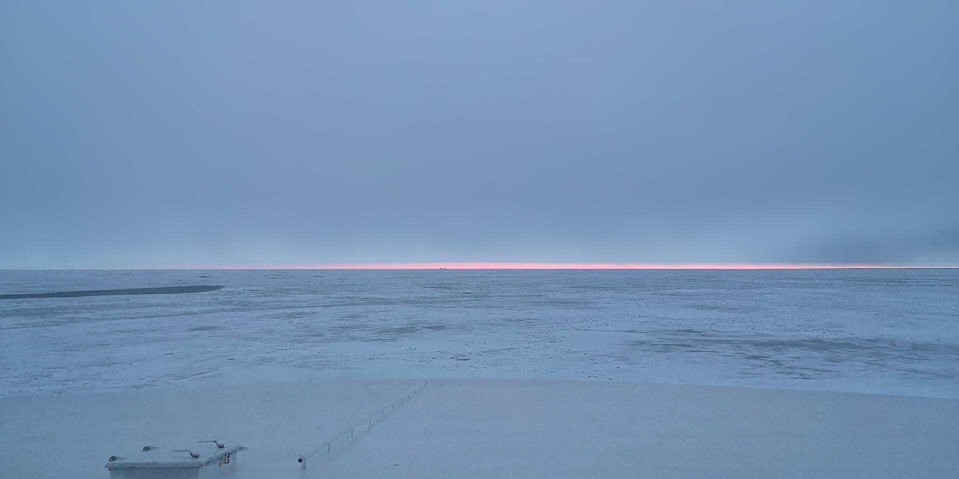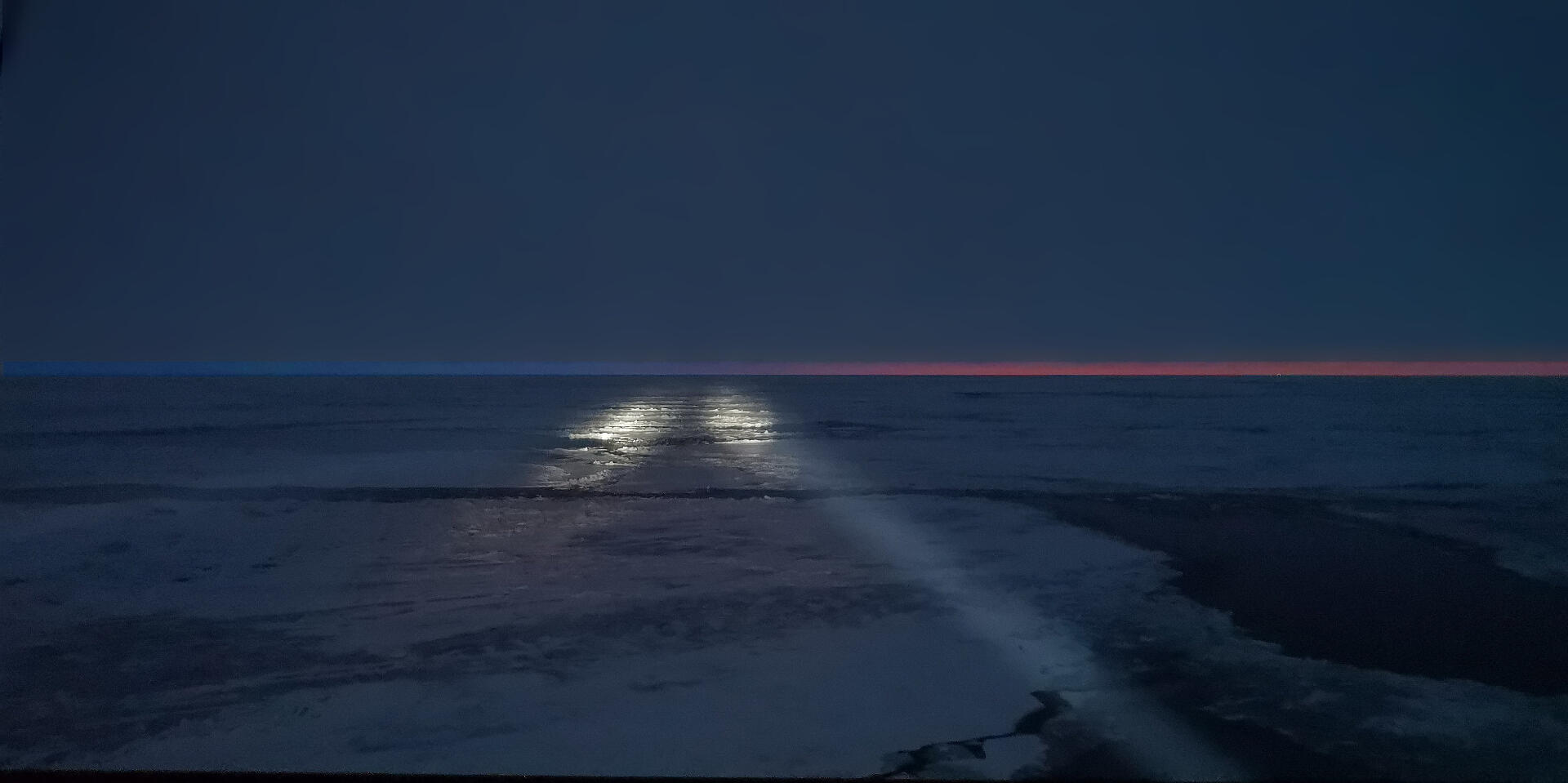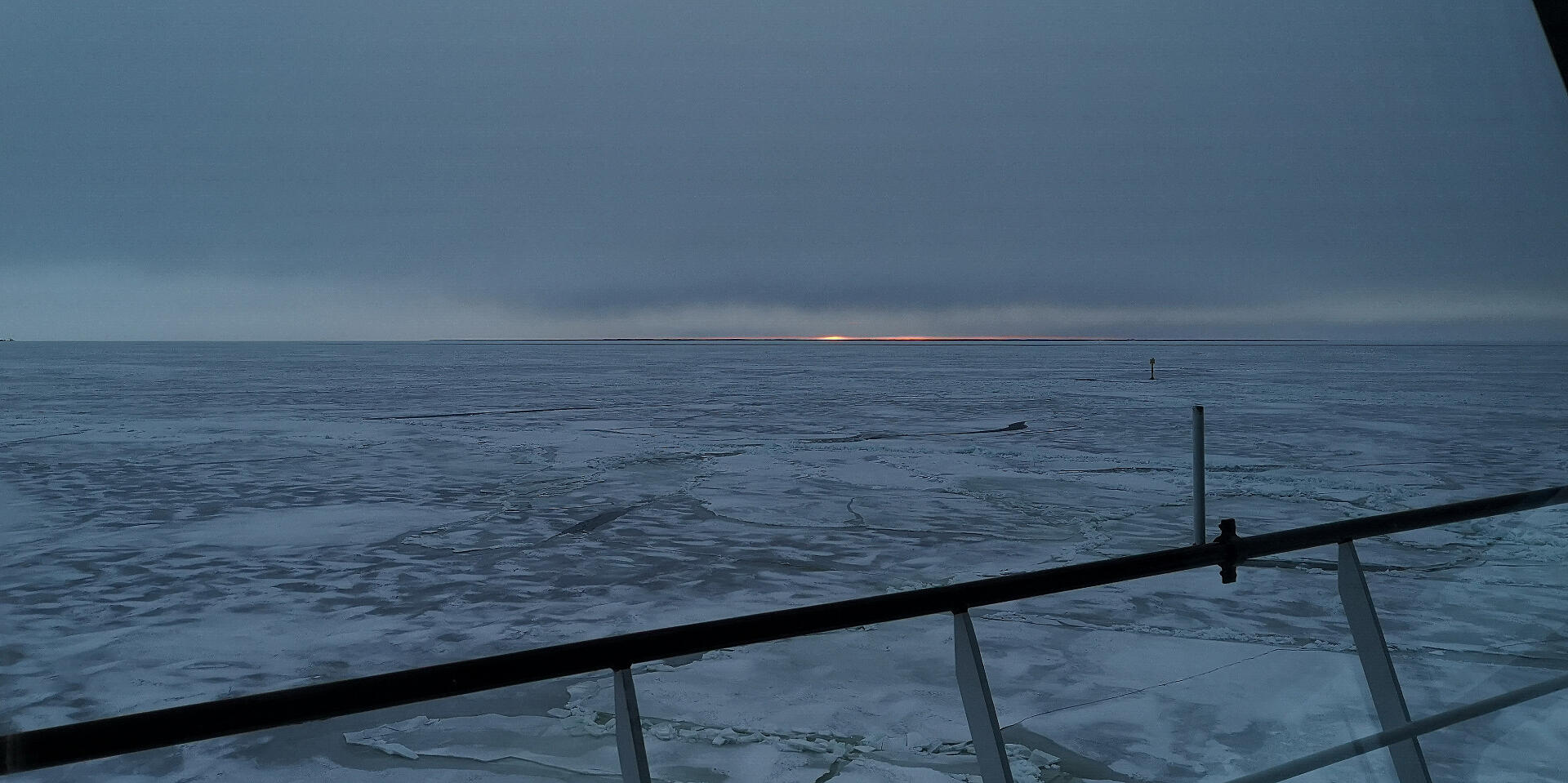 | . | 06.25 | . | . | "Wenn sanft das Mondlicht auf den Huegeln schläft" kommt uns in den Sinn. Wir sind kurz auf der Bruecke und sehen uns das Schauspiel der Scheinwerfer auf dem Eis an. Am Horizont der erste schmale rote Streifen: die Sonne geht auf | . | - 01 |