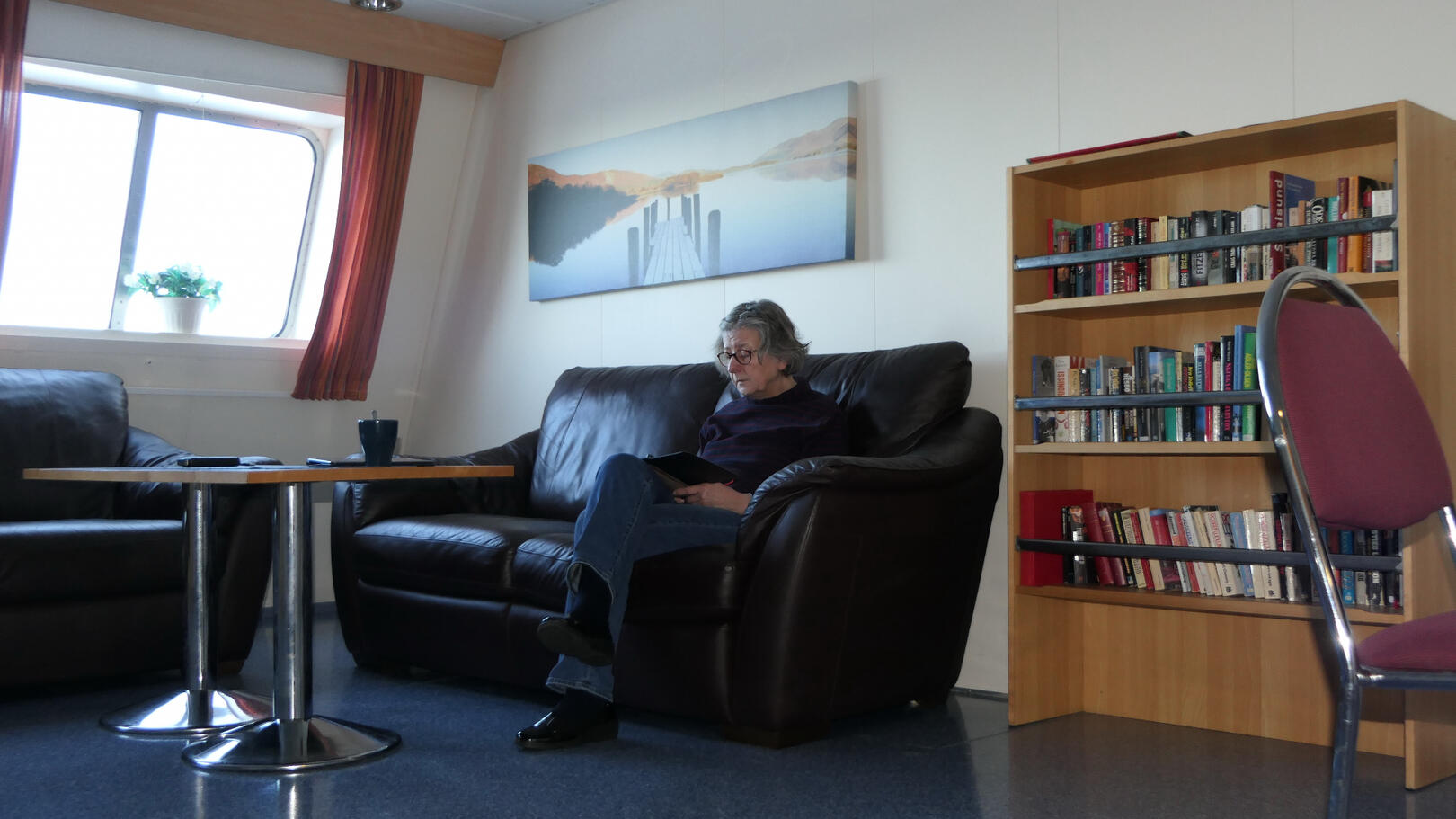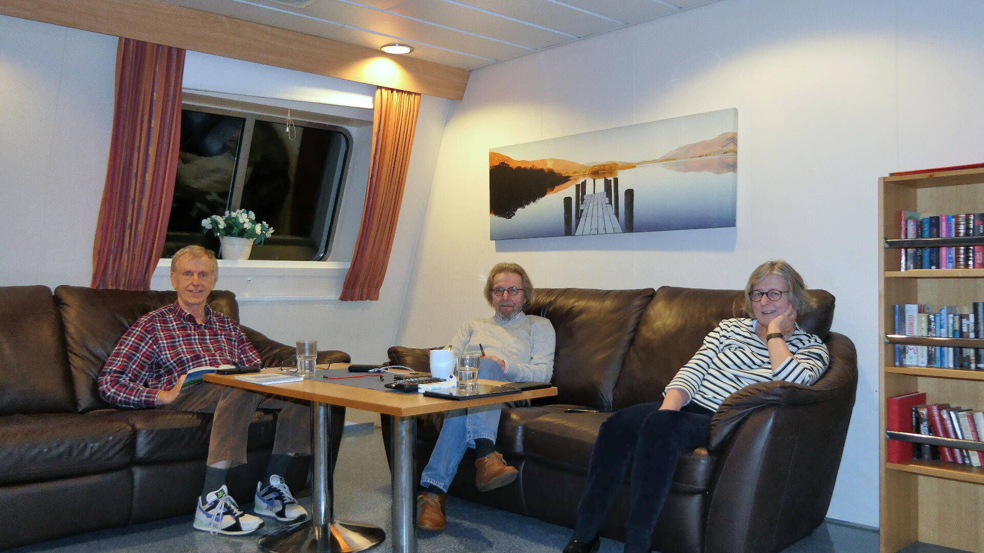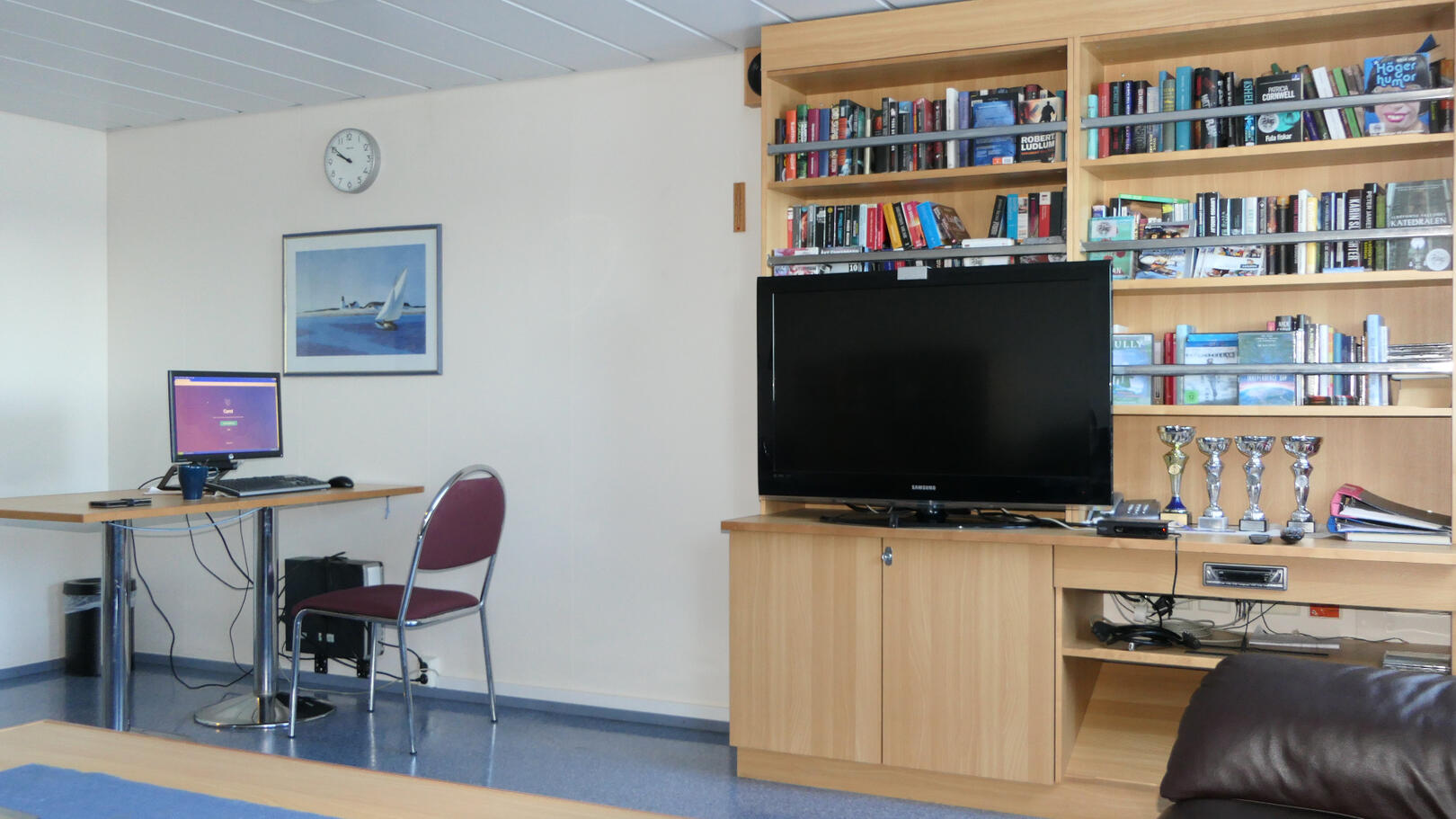 Wir sind 20 Mann an Bord, 17 Mann/Frau Besatzung (11 Schweden incl 2 Azubis sowie 6 Filipinos) und 3 Passagiere. Alles - ausser den Kammern mit ca 8 qm - ist sehr grosszuegig ausgelegt, wir haben unseren eigenen Aufenthaltsraum mit Doppelsofas, Sitzecke, Monster-TV, DVDs, Hörbuechern und Schmökern, letzteres allerdings alles auf Schwedisch.