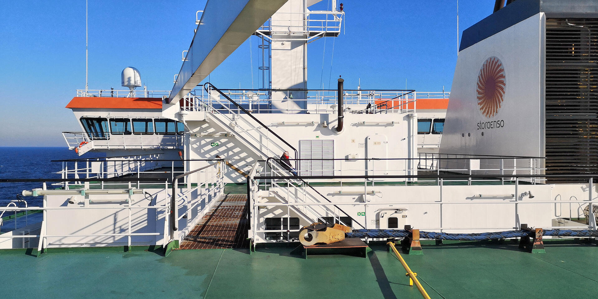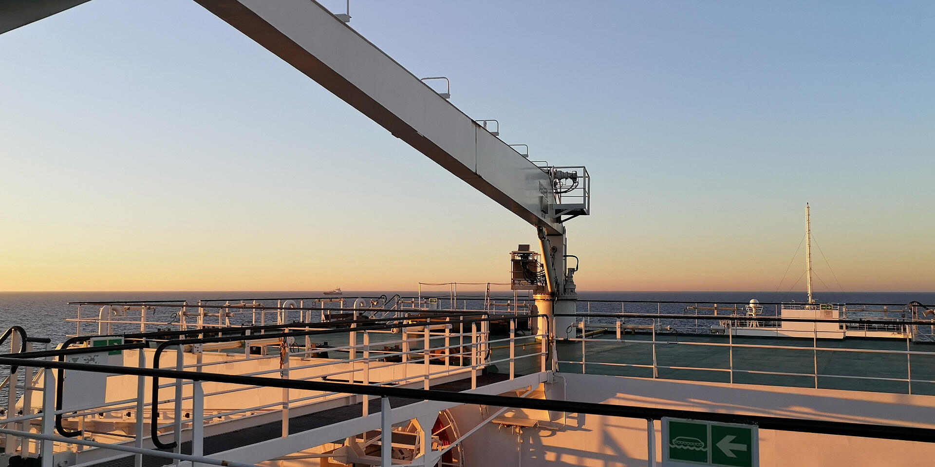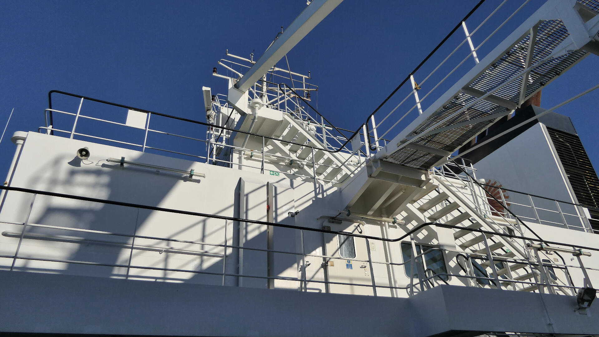 3 mal am Tag machen wir unseren Rundgang - den Catwalk - also vom Bug nach achtern und zurueck an den (leeren) Containern vorbei, meist auf der Steuerbordseite, da wir dort Sonne haben.