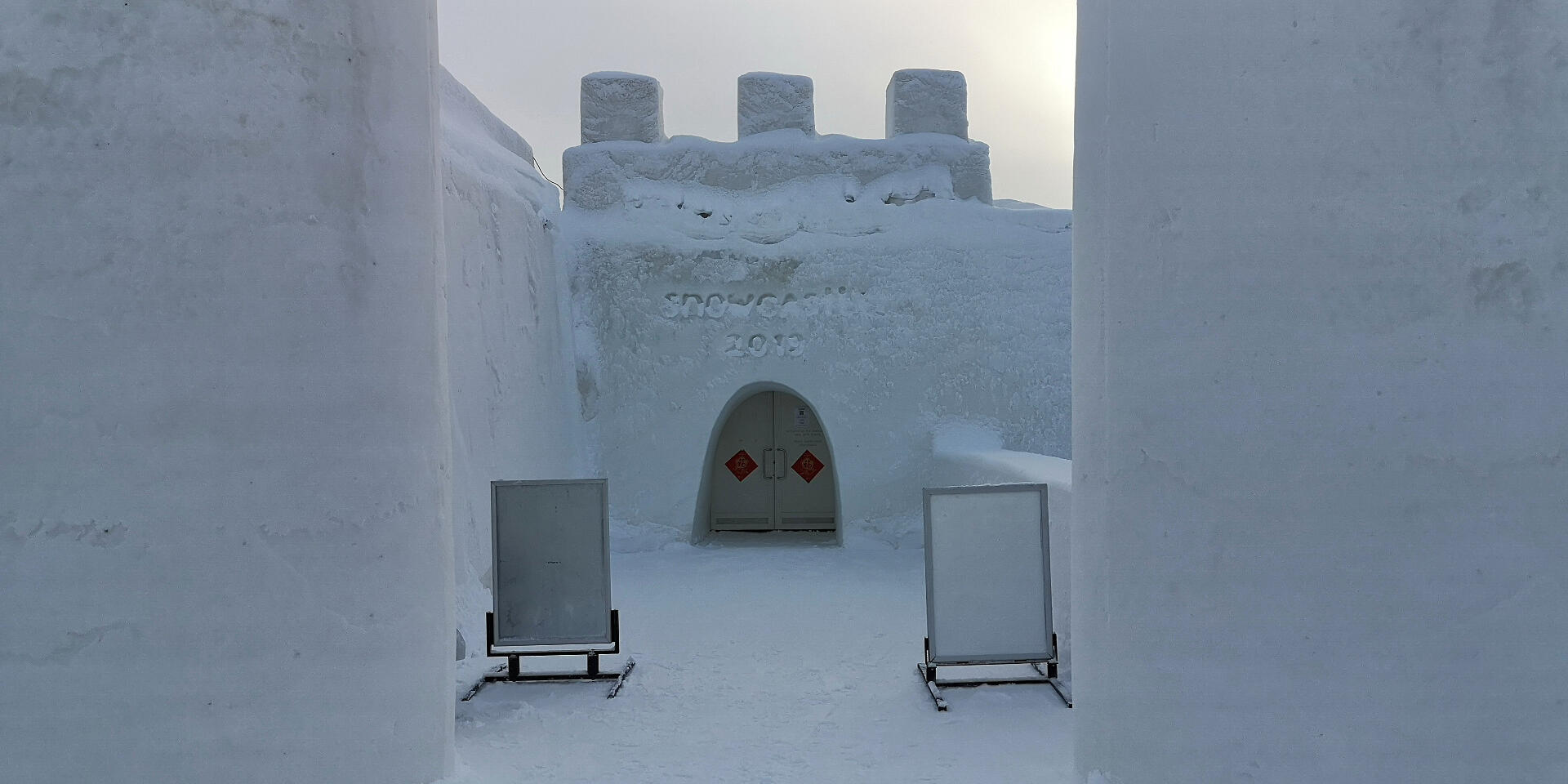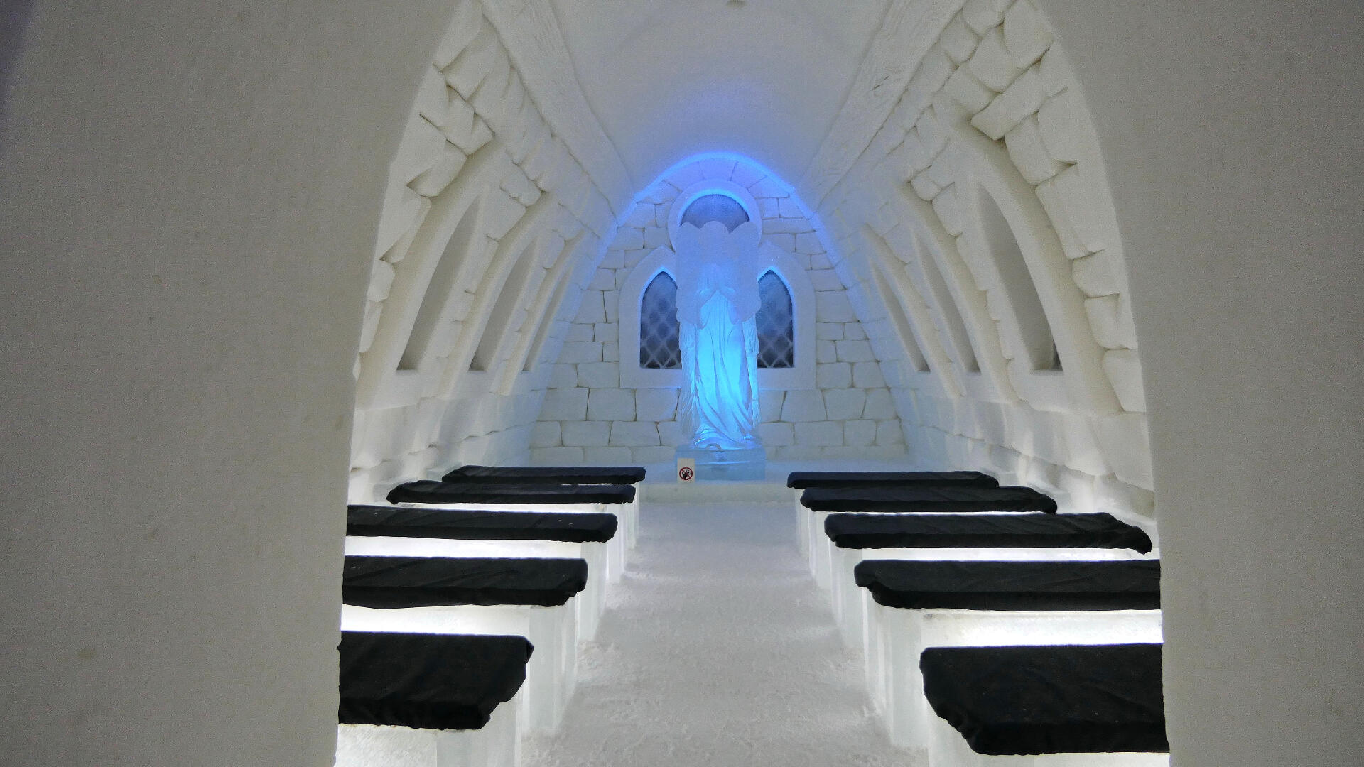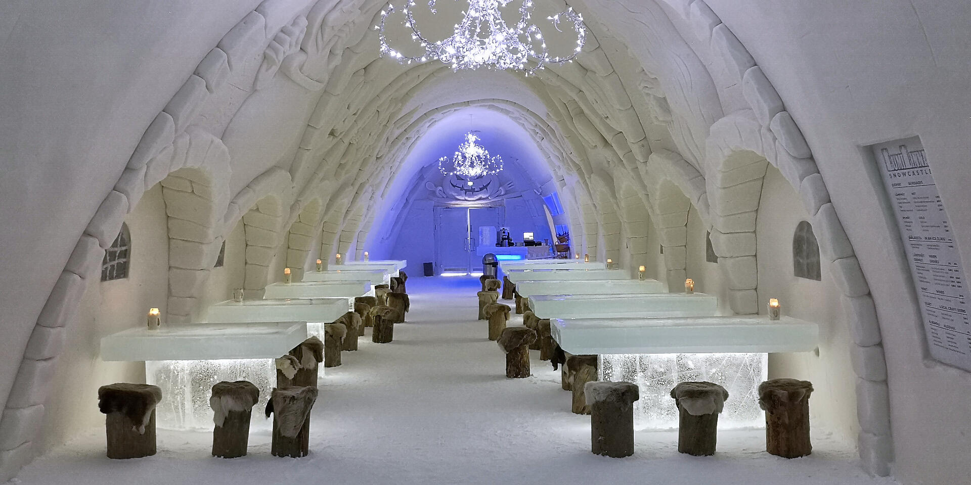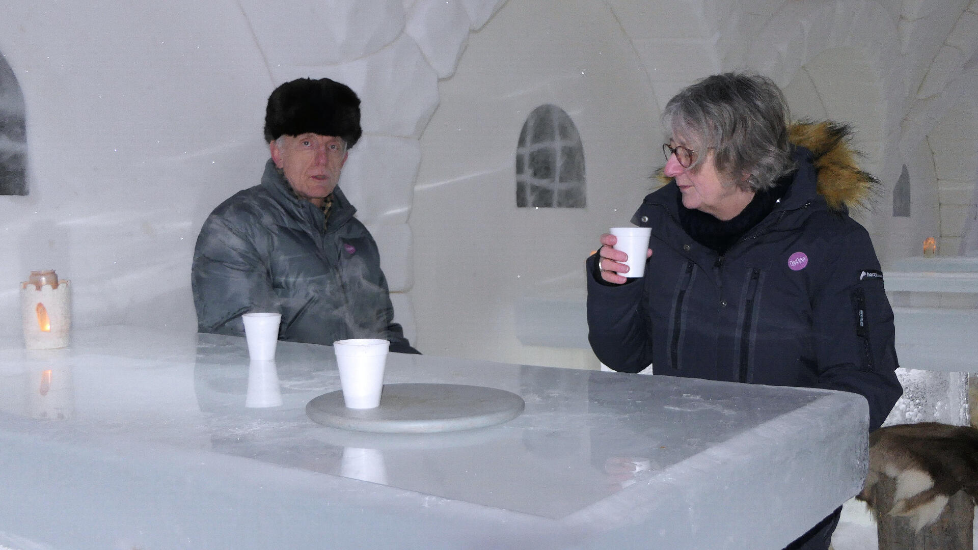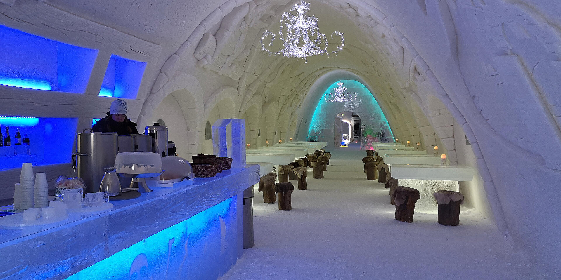 | . | 09.00 | 10.15 | . | Heute ist das Glueck auf unserer Seite: Das "Snow Castle" öffnet bereits um 09.00 Uhr (10.00 Uhr finnischer Zeit). Wir kaufen unsere Tickets (30 € pp) und betreten das Gelände. Rechter Hand hinter dem eigentlichen Hotelkomplex liegen die Lodges direkt am zugefrorenen bottnischen Meerbusen. Das "Snow Castle" selbst ist ein aus purem Eis errichtetes "Gebäude" mit Restaurant (Eistische), Uebernachtsmöglichkeiten in "Eisbetten", einer Kapelle (in der man auch getraut werden kann) und diversen Skulpturen - alles sehr stilvoll beleuchtet, Innentemperatur -4°: ein absolutes Highlight der Reise! | Sonne | - 04 |