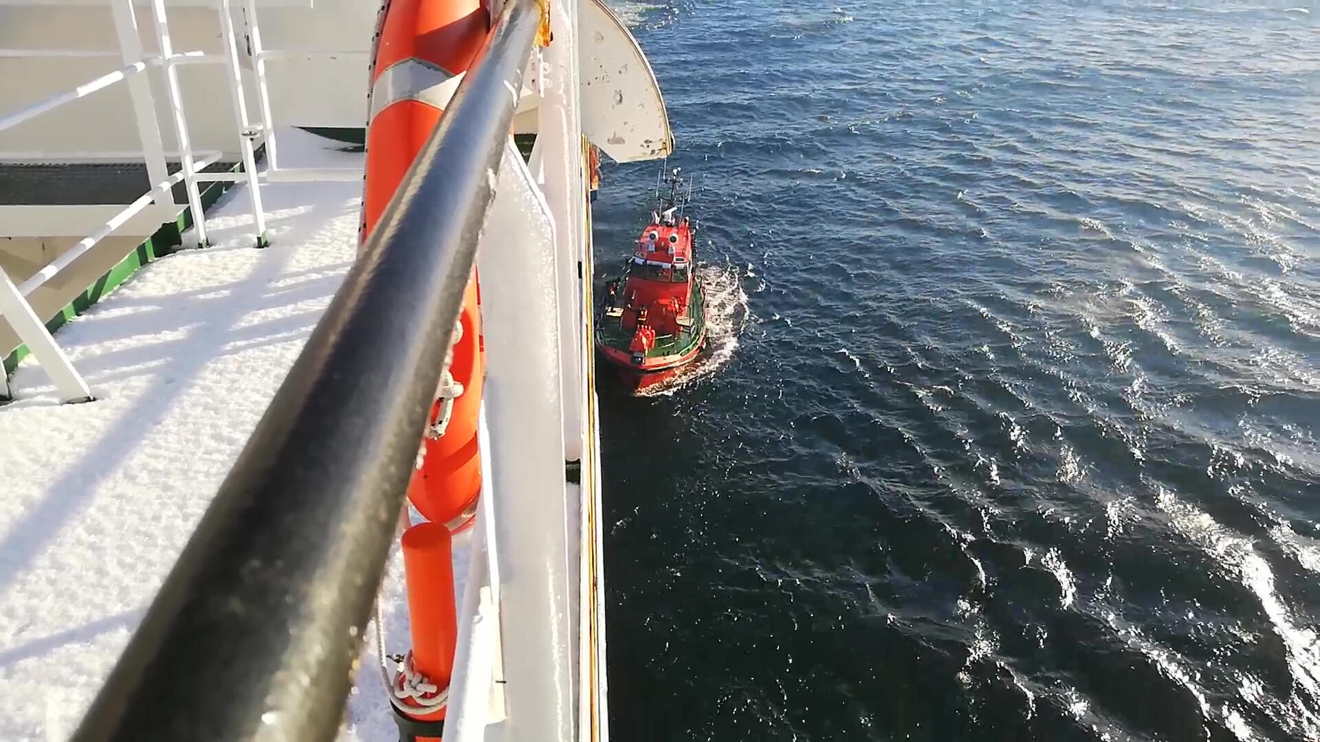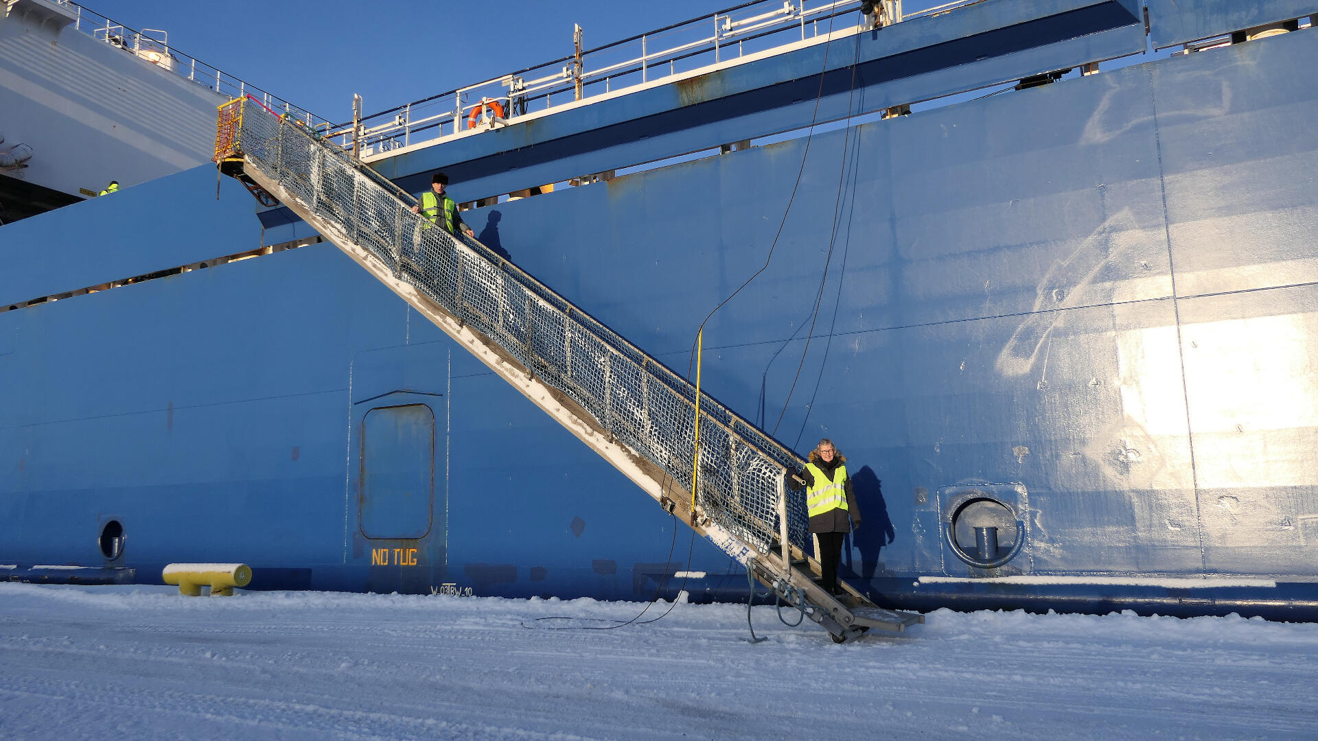 Interessant im Winter: Der Lotse geht an Bord (bitte Klick auf das rechte Foto)