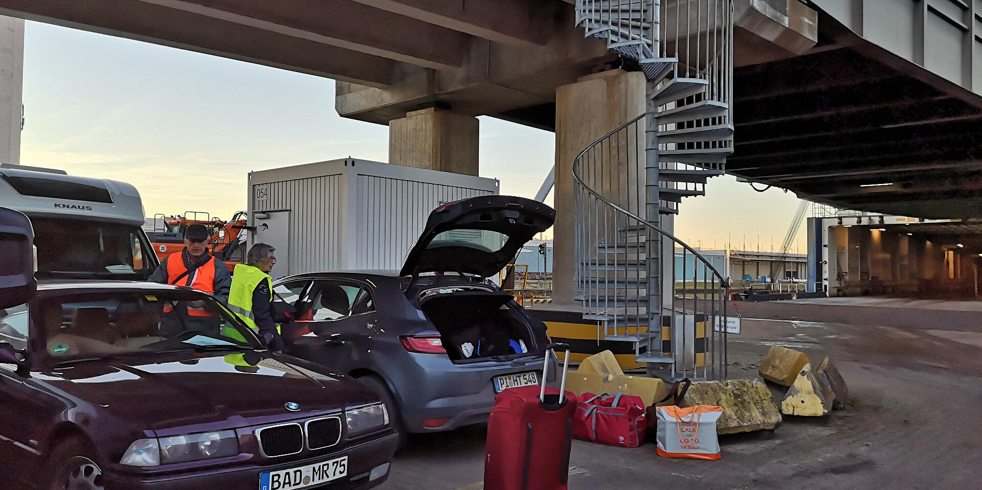| . | 07.30 | . | . | Wir beginnen unsere Sachen zu packen und die Betten abzuziehen, dann gehen wir auf die Brücke und beobachten das Anlegen in Schlutup | . | . |